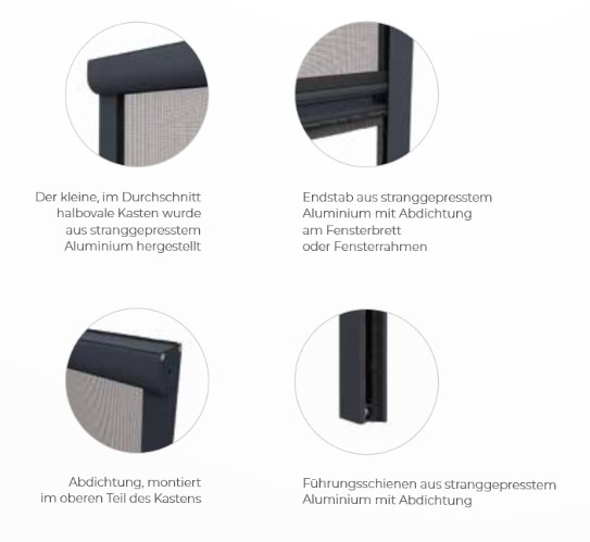 Die Konstruktion (Kasten, Führungsschienen, Endstab) besteht aus stranggepresstem, pulverbeschichtetem